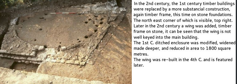 Excavation continued over several seasons and the picture emerged of a substantial villa building at the centre of a large agricultural estate standing inside a ditched enclosure most likely to keep animals out rather than being defensive in nature. The enclosure dated from the first century note the north leg is almost parallel with the later church tower. The enclosure ditch was shortened in the second century.